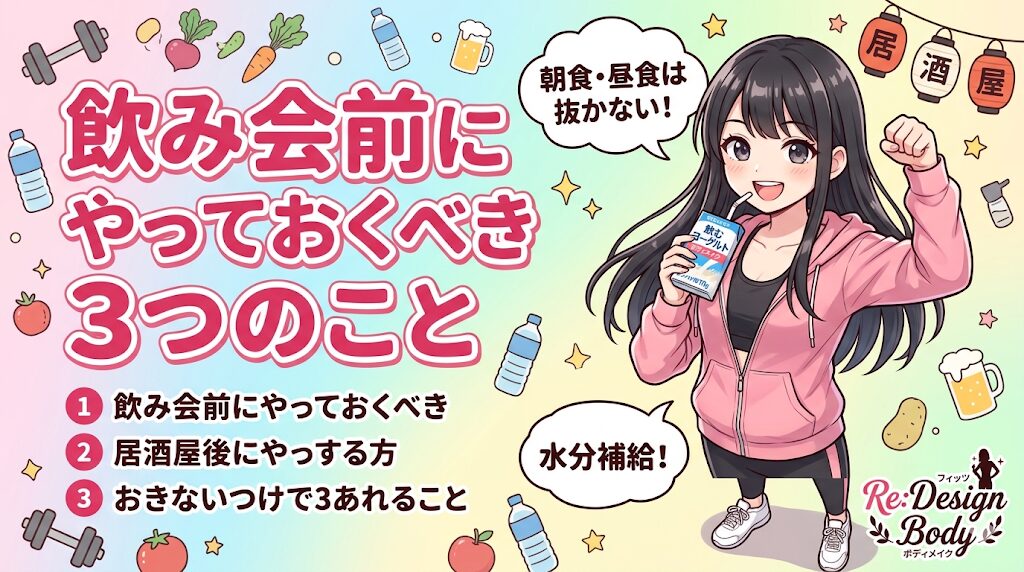飲み会当日の食事内容だけでなく、その日の過ごし方全体で差が出ます。