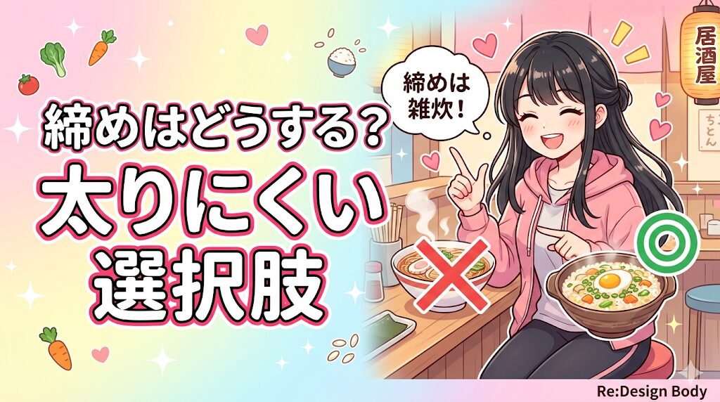 飲み会の締めは最大の落とし穴です。アルコールで判断力が鈍り、炭水化物を食べたくなるのは自然な現象。でも夜遅い時間の高糖質は脂肪になりやすいので要注意。